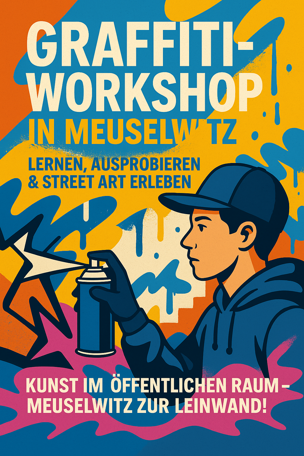 Graffiti-Workshop in Meuselwitz – Farbe, Kreativität & Street Art erleben Lernen, ausprobieren, loslegen! Beim Graffitievent in Meuselwitz können Jugendliche und Interessierte unter Anleitung erfahrener Künstler*innen eigene Kunstwerke gestalten. In einem offenen Workshop lernen sie den sicheren Umgang mit Spraydosen, kreative Techniken und die Basics von Street Art. Das Ziel: Einen legalen Raum für Ausdruck schaffen – kreativ, bunt und gemeinschaftlich. Der Workshop fördert Talente, baut Vorurteile ab und bringt frischen Wind an graue Wände. Kunst im öffentlichen Raum – Meuselwitz wird zur Leinwand!
